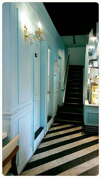 通往2F的走道..藍色的牆面妝點著浪漫的水晶燈..