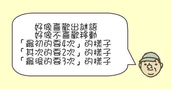 好像喜歡出謎語 好像不喜歡移動 「最初的要4次」的樣子 「其次的要2次」的樣子 「最後的要3次」的樣子