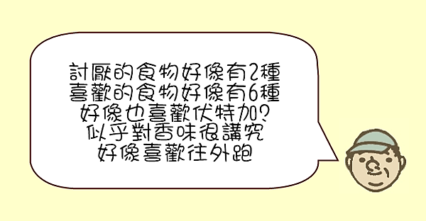 討厭的食物好像有2種 喜歡的食物好像有6種 好像也喜歡伏特加? 似乎對香味很講究 好像喜歡往外跑